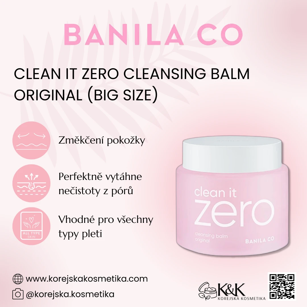 Clean it Zero Cleansing Balm Original je balzámový (voskový) odličovač make-upu s velkou kapacitou 180 ml, navržený tak, aby účinně odstranil make-up a nečistoty z pleti, aniž by způsobil pocit suchosti pleti. Clean it Zero Cleansing Balm Original, známý jako jeden ze slavných odličovacích produktů společnosti Banila Co., obdržel od uživatelů mnoho komplimentů za své hloubkové čištění a hydrataci.