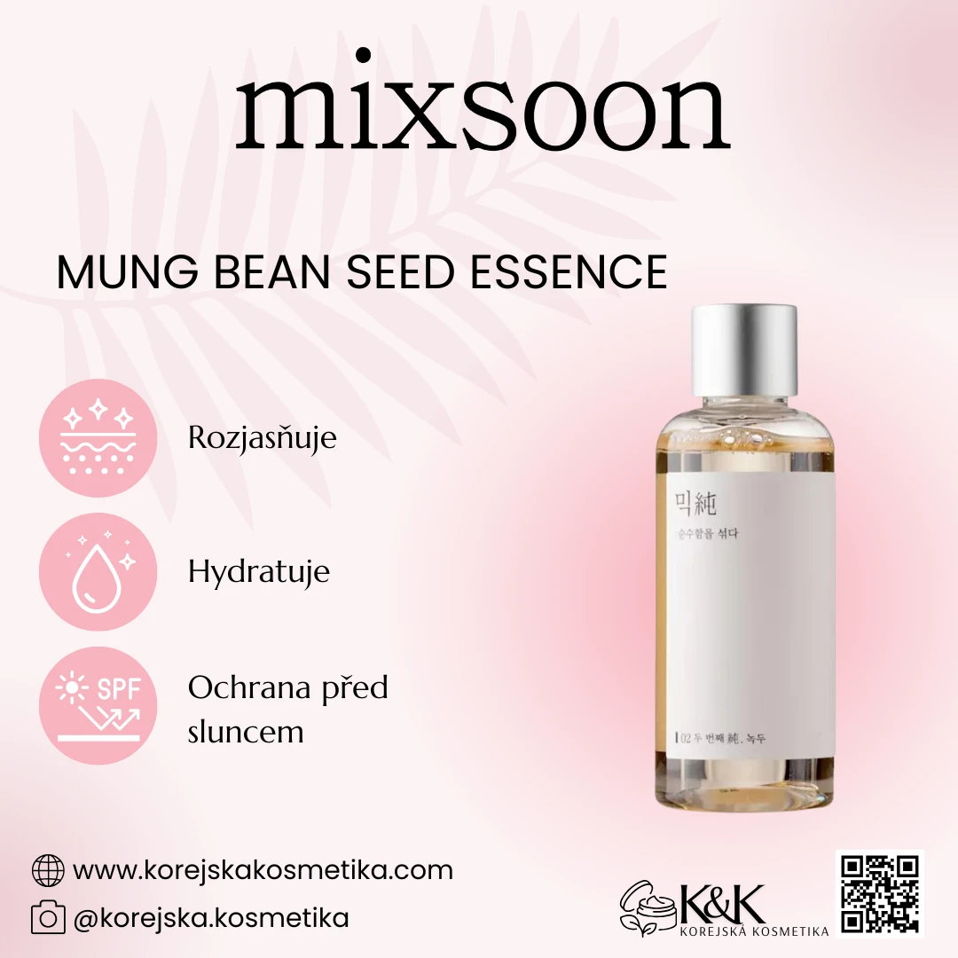 MIXSOON Mung Bean Seed Essence je esence pečující o pleť extrahovaná z mungo fazolí, která poskytuje čistící, hydratační a zklidňující účinky na pokožku. Produkt je navržen s jednoduchým, ale vysoce účinným složením, které pomáhá přirozeně zlepšovat stav pokožky.
