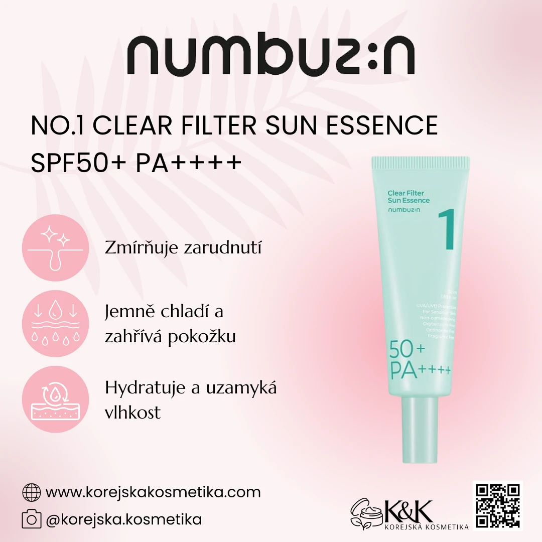 Numbuzin – No.1 Clear Filter Sun Essence SPF50+ PA++++ – Rozjasňující filtrační esence – 50ml Popis Numbuzin’s No.1 Clear Filter Sun Essence je silný opalovací přípravek s SPF50+ PA++++, který pomáhá chránit pokožku před škodlivými účinky UV paprsků. Tento produkt poskytuje nejen ochranu před slunečním zářením, ale také obsahuje mnoho výživných, zklidňujících a hydratačních složek, které pomáhají zlepšit celkové zdraví pokožky. Přípravek obsahuje • Centella Asiatica Extract: Zklidňuje pokožku, podporuje hojení ran a je protizánětlivý. • Houttuynia Cordata Extract: Protizánětlivé, antibakteriální a zklidňující pokožku. • Ethylhexyl Triazone: Účinná chemická opalovací složka. • Terephthalylidene Dicamphor Sulfonic Acid: Poskytuje silnou ochranu před sluncem. • Niacinamide: Rozjasňuje pokožku, působí protizánětlivě a zlepšuje kožní bariéru. • Diethylamino Hydroxybenzoyl Hexyl Benzoate: Chemická složka opalovacího krému, která chrání pokožku před UVA paprsky. • Sodium Hyaluronate: Hluboce hydratuje, dělá pokožku jemnou a vláčnou. • Aloe Barbadensis Leaf Extract: Zklidňuje a hydratuje pokožku. Vlastnosti • Komplexní ochrana pokožky: Účinná sluneční ochrana s indexem SPF50+ PA++++, která chrání pokožku před UVA a UVB paprsky. • Hydratační a zklidňující: Poskytuje vlhkost a zklidňuje pokožku, zabraňuje vysoušení a podráždění pokožky. • Rozjasňuje pleť: Niacinamid pomáhá rozjasnit a sjednotit tón pleti, což má za následek zářivější pleť. • Nemastný: Jemné složení, snadno se vstřebává, nezanechává na pokožce pocit mastnoty. Použitím 1. Očistěte pleť a aplikujte toner/sérum, pokud možno. 2. Naberte dostatečné množství přípravku do dlaně. 3. Naneste rovnoměrně na obličej a krk, jemně vklepejte pro lepší absorpci produktu. 4. Používejte denně ráno, alespoň 15-20 minut před odchodem ven. 5. Aplikujte znovu každé 2 hodiny , pokud jste vystaveni slunečnímu záření nebo po plavání/pocení. Vhodné pro pokožku • Všechny typy pleti: Vhodné pro suchou pleť, mastnou pleť, smíšenou pleť a citlivou pleť. • Citlivá a snadno podrážděná pokožka: Zklidňující a nedráždivé složky pomáhají chránit citlivou pokožku. • Kůže potřebuje komplexní ochranu: Ti, kteří se pravidelně vystavují slunci a chtějí svou pokožku zcela chránit. Key Ingredients Glycyrrhiza Glabra (Licorice) Root Water, Centella Asiatica Extract, Houttuynia Cordata Extract, Aqua, Dibutyl Adipate, Propanediol, Butyloctyl Salicylate, Ethylhexyl Triazone, Terephthalylidene Dicamphor Sulfonic Acid, Polymethylsilsesquioxane, Niacinamide, Tromethamine, Polyglyceryl-3 Distearate, 1,2-hexanediol, Pentylene Glycol, Diethylamino Hydroxybenzoyl Hexyl Benzoate, Cetearyl Alcohol, Caprylyl Methicone, Polysilicone-15, Melia Azadirachta Leaf Extract, Coccinia Indica Fruit Extract, Eclipta Prostrata Extract, Melia Azadirachta Flower Extract, Anastatica Hierochuntica Extract, Hyacinthus Orientalis (Hyacinth) Extract, Polygonatum Officinale Rhizome/Root Extract, Lycium Chinense Fruit Extract, Velvet Extract, Ophiopogon Japonicus Root Extract, Polygonum Multiflorum Root Extract, Astragalus Membranaceus Root Extract, Atractylodes Lancea Root Extract, Laminaria Japonica Extract, Ulmus Davidiana Root Extract, Aloe Barbadensis Leaf Extract, Viola Mandshurica Flower Extract, Dioscorea Japonica Root Extract, Sodium Hyaluronate, Glyceryl Stearate, Bis-ethylhexyloxyph Enolmethoxyphenyl Triazine, Potassium Cetyl Phosphate, Butylene Glycol, Methylpropanediol, Carbomer, Acrylates/c10-30 Alkyl Acrylate Crosspolymer, Glyceryl Stearate Citrate, Ethylhexylglycerin, Xanthan Gum, Adenosine, Polyether-1, Madecassoside, Biosaccharide Gum-1, Glycerin, Dimethylsilanol Hyaluronate, Hydrolyzed Sodium Hyaluronate, Hydrolyzed Hyaluronic Acid, Potassium Hyaluronate, Hyaluronic Acid, Sodium Hyaluronate Crosspolymer, Hydroxypropyltrimonium Hyaluronate, Sodium Hyaluronate Dimethylsilanol, Sodium Acetylated Hyaluronate