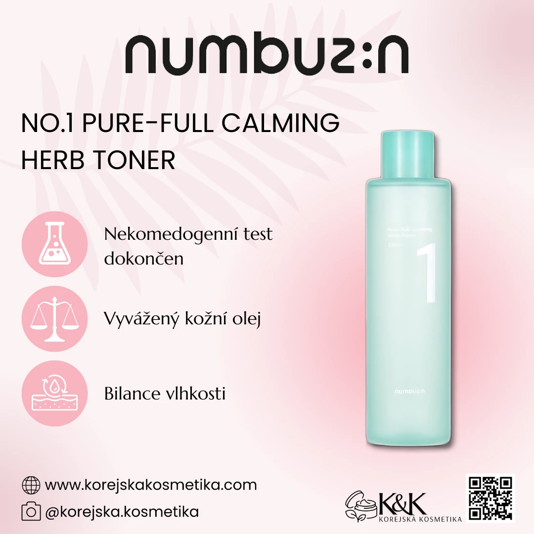 No.1 Pure-full Calming Herb Toner od Numbuzinu je pleťové tonikum s obsahem přírodních bylinných složek. Toto tonikum je navrženo tak, aby hydratovalo, zklidňovalo a vyrovnávalo pokožku, a zároveň pomáhá zlepšovat texturu pokožky a zanechává pokožku jemnou, hladkou.
