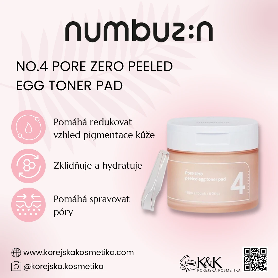 No.4 Pore Zero Peeled Egg Toner Pad je produkt péče o pleť ve formě praktického tonerového polštářku, který pomáhá čistit póry, vyrovnávat mastnotu a udržovat pokožku hladkou jako loupané vejce. Přípravek obsahuje hydratační a jemné exfoliační složky, vhodné pro mastnou a smíšenou pleť.