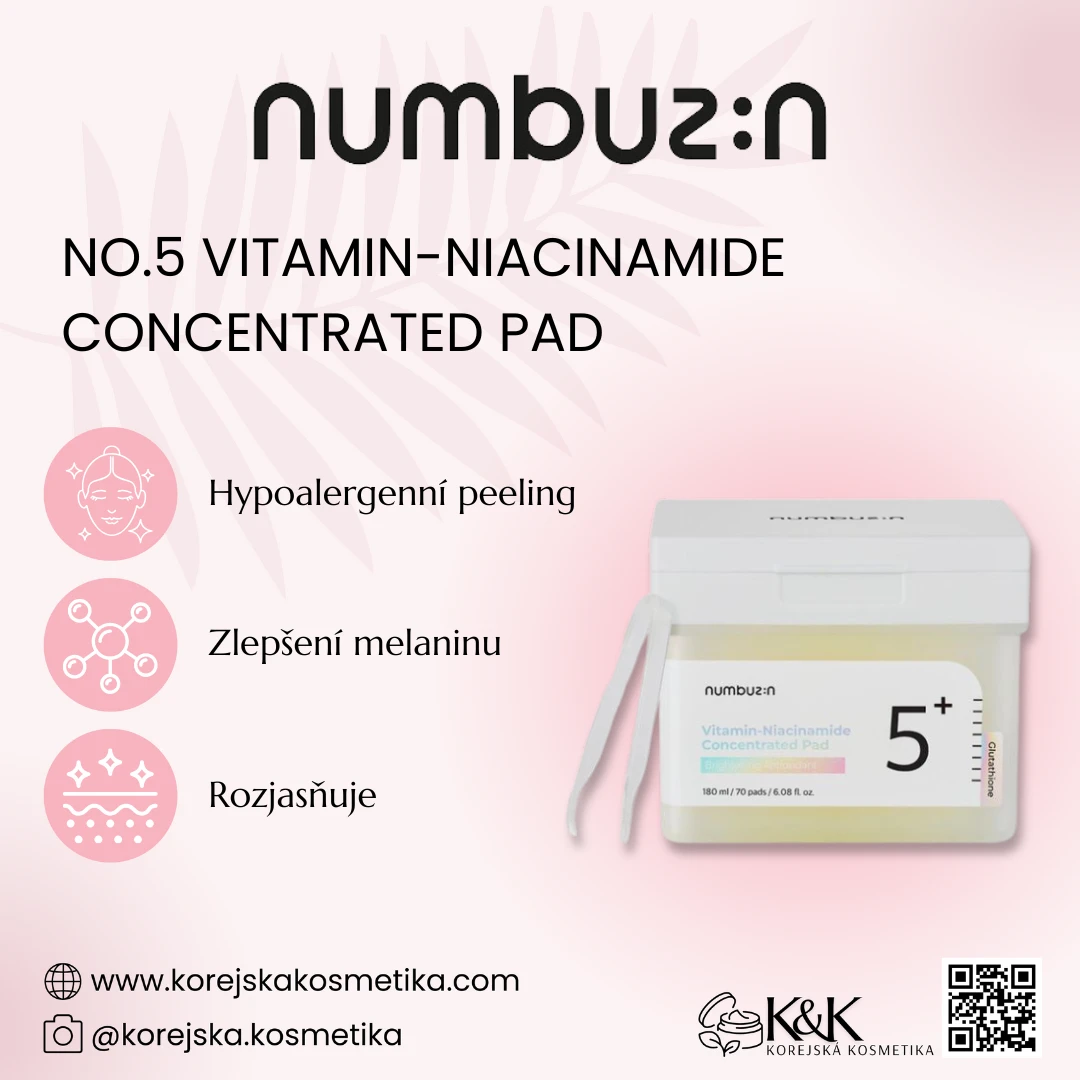No.5 Vitamin-Niacinamide Concentrated Pad je produkt péče o pleť ve formě tonerového polštářku, navržený tak, aby poskytoval pokožce rozjasňující živiny, jemnou exfoliaci a hydrataci. Produkt obsahuje silné antioxidační a rozjasňující složky, jako je niacinamid, vitamín C a glutathion, které pomáhají rozjasnit pleť a zlepšit tón pleti.